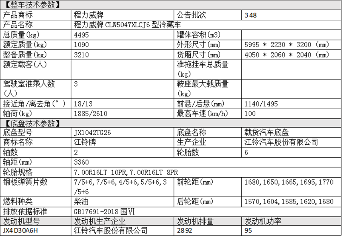 國六江鈴順達寬體冷藏車,整車型號:CLW5047XLCJ6,整車尺寸:5995*2230*3200(mm),廂體內徑尺寸:4050*2060*2040(mm),江西五十鈴130馬力,700鋼絲胎,5擋變速箱,動力轉向,方向助力,原廠空調,多功能方向盤,中控鎖,遙控鑰匙,電動門窗,ABS,汽剎,軸距3360mm。